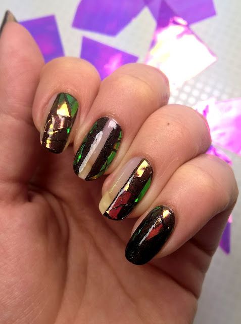 Jeśli chodzi o zdobienie, to wiedziałam od razu, że nie chcę po prostu zrobić czarnych paznokci, a na nich kawałków folii, dlatego zdecydowałam się połączyć to zdobienie z negative spacem. Jedynie mały paznokieć jest pomalowany w całości, ale nawet on nie jest cały pokryty folią. Dodatkowo, żeby nie było nudno, w roli czarnego lakieru możecie zobaczyć holosia - niestety w sztucznym świetle nie migocze się tak ładnie jak w słońcu, dlatego na zdjęciach są tylko srebrne kropki :(
